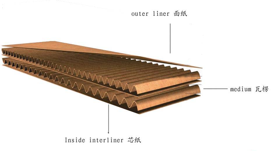 瓦楞纸板是一个多层的黏合体,它至少由一层波浪形芯纸夹层(俗称“坑张”或“瓦楞纸”)及一层纸板(俗称瓦楞纸板“牛皮咭”)构成。它有很高的机械强度,能抵受搬运过程中的碰撞和摔跌。瓦楞纸箱的实际表现取决于三项因素:芯纸和纸板的特性及纸箱本身的结构。